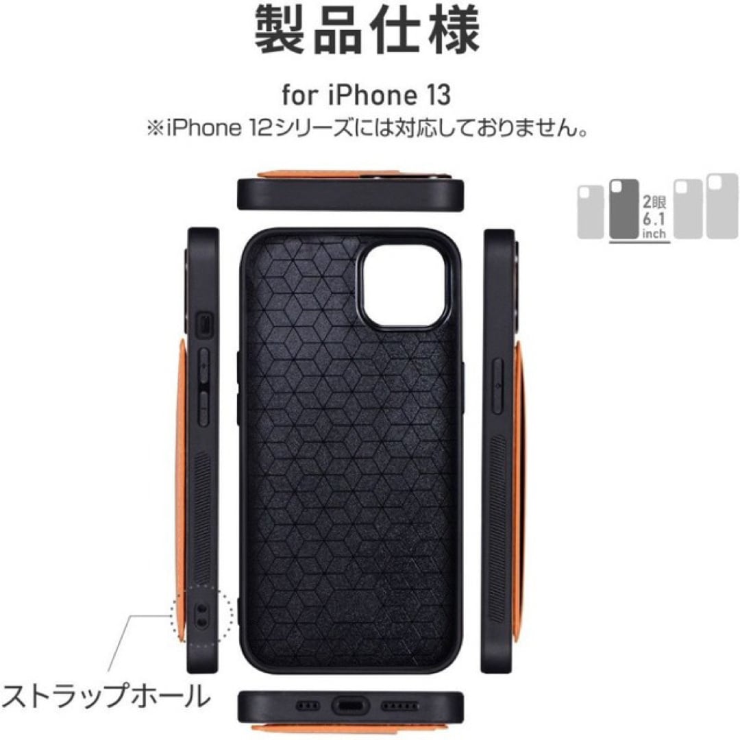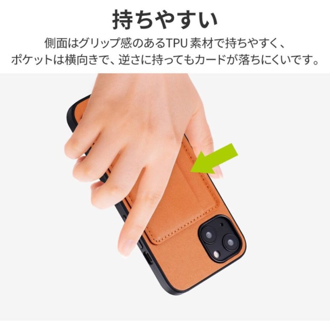 ・【対応機種】iPhone13 (6.1inch 2眼)【参考基準価格】2,980円【商品説明】スリムなのにマルチな機能、耐衝撃ハイブリッドケース背面ポケットがスタンドに変化するPUレザーケース逆さに持ってもカードが落ちにくい横向きポケット動画視聴にも最適薄型マグネットでポケットをピタッと固定柔軟性の高いTPUケース採用ストラップホール搭載★シンプルなのに、機能的で使いやすい手に持ったときにカードが下に落下するのを防ぐため、横向きに差し込むタイプのカードポケットを使用。また、側面はグリップ感のあるTPU素材に細かな溝を設けることで持ちやすさをさらに高めました。★スマートなスタンド機能ポケットは動画視聴時などに便利なスタンドとしても使用可能。使わないときはマグネットでしっかり固定でき、邪魔にならないよう配慮されています。★精密設計スピーカーや充電口の周囲、ボタン周囲まできっちり保護する精密設計です。★ストラップホール付き★端末から突出したカメラ部分に合わせたカメラ保護【機能】・スタンド機能・ストラップホール付・マグネット付・ポケット付【材質】TPU + PUレザー【本体重量】46g【カラー】キャメルブラウン (茶色)※外箱を外し簡易包装での発送になります。
