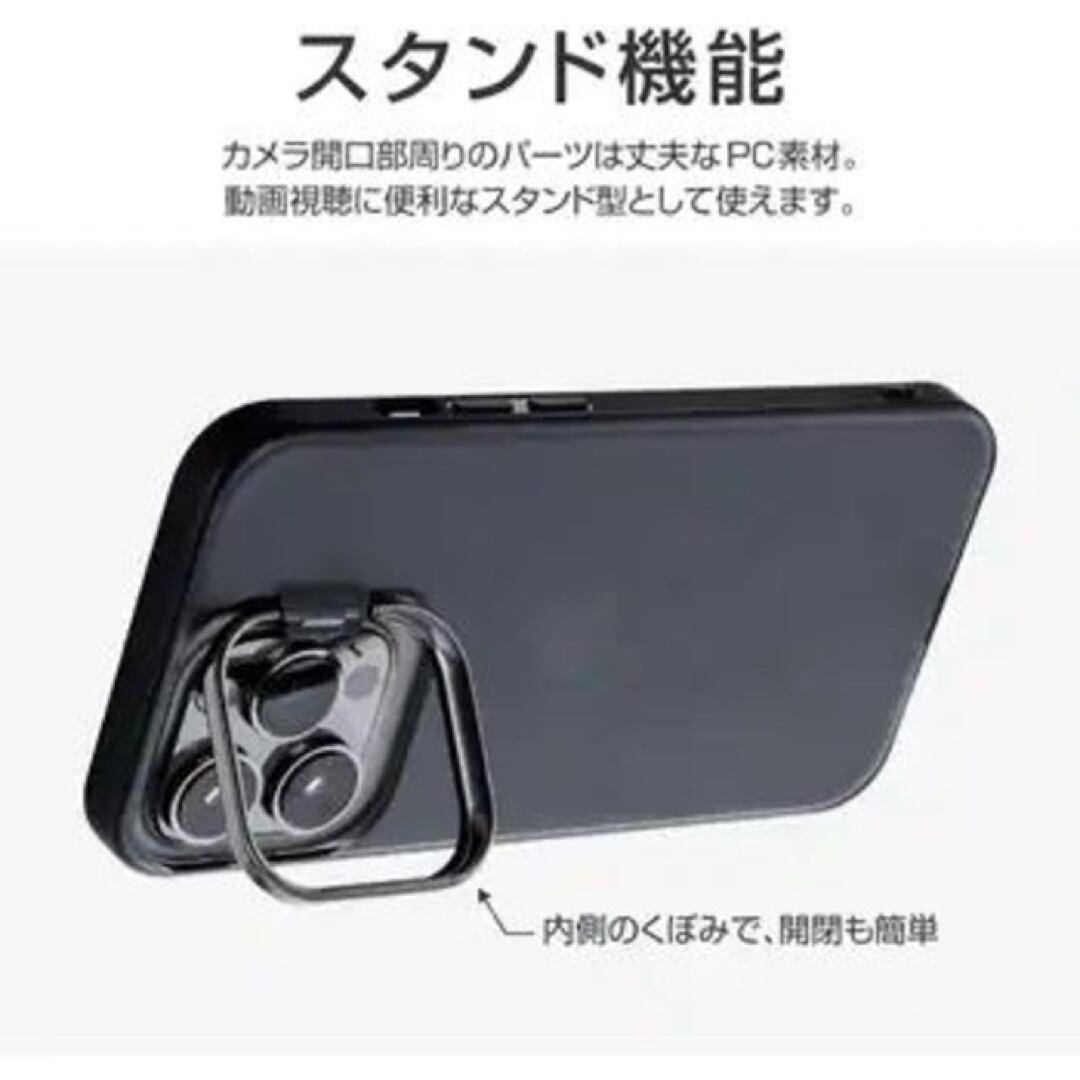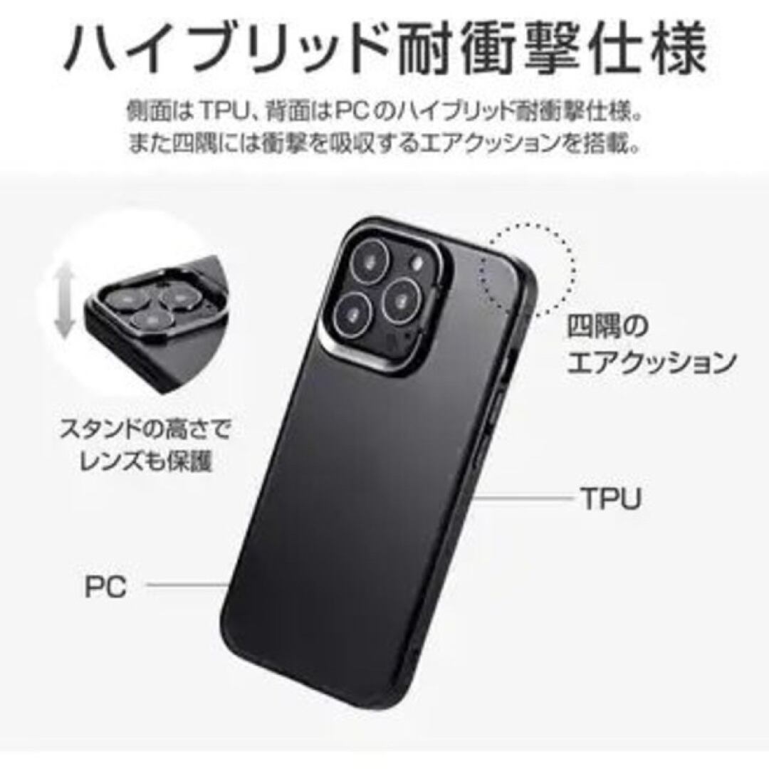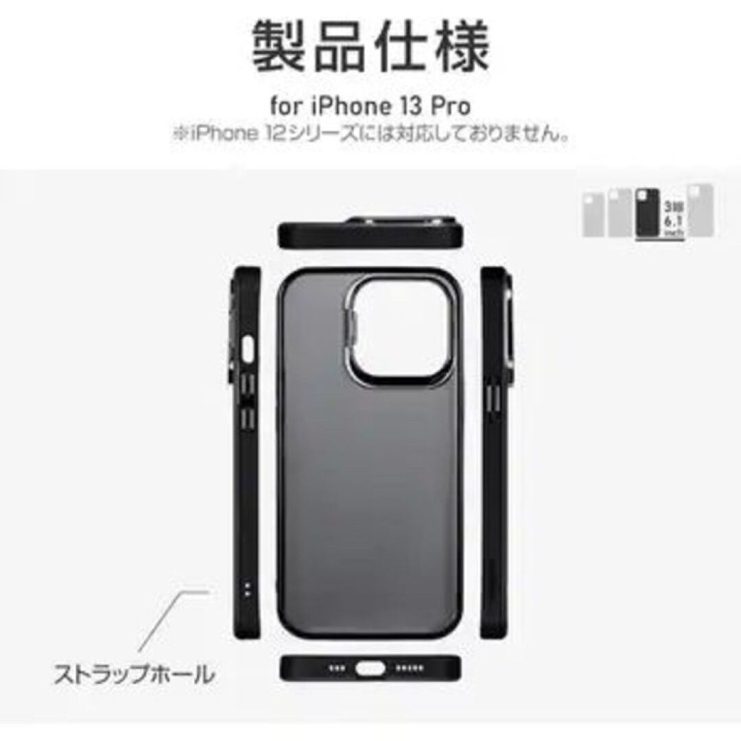 ・【対応機種】iPhone13Pro (6.1inch 3眼)【参考基準価格】2,280円カメラレンズ保護可能でワイヤレス充電に干渉しないスタンド付ケースレンズ周囲を高く設計したカメラレンズ保護仕様側面はTPU、背面はPCのハイブリッド耐衝撃仕様端末本体を活かすハーフクリア&スリムデザイン四隅のエアクッションが落下時の衝撃を吸収ストラップホール搭載★ハイブリッド耐衝撃仕様端末本体を活かすクリアなスリムデザインで、側面はTPU、背面はPCのハイブリッド耐衝撃仕様です。★スタンド機能カメラの周囲を覆うメタリックパーツが、動画視聴時などに便利なスタンドとして使用できます。★精密設計スピーカーや充電口の周囲、ボタン周囲まできっちり保護する精密設計です。★端末から突出したカメラ部分に合わせたカメラ保護【機能】・耐衝撃・スタンド機能・ストラップホール付【材質】TPU+PC【カラー】フロストブラックブラック (黒)クリアブラック※外箱を外し簡易包装での発送になります。