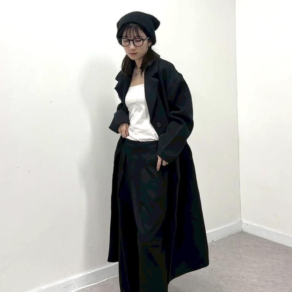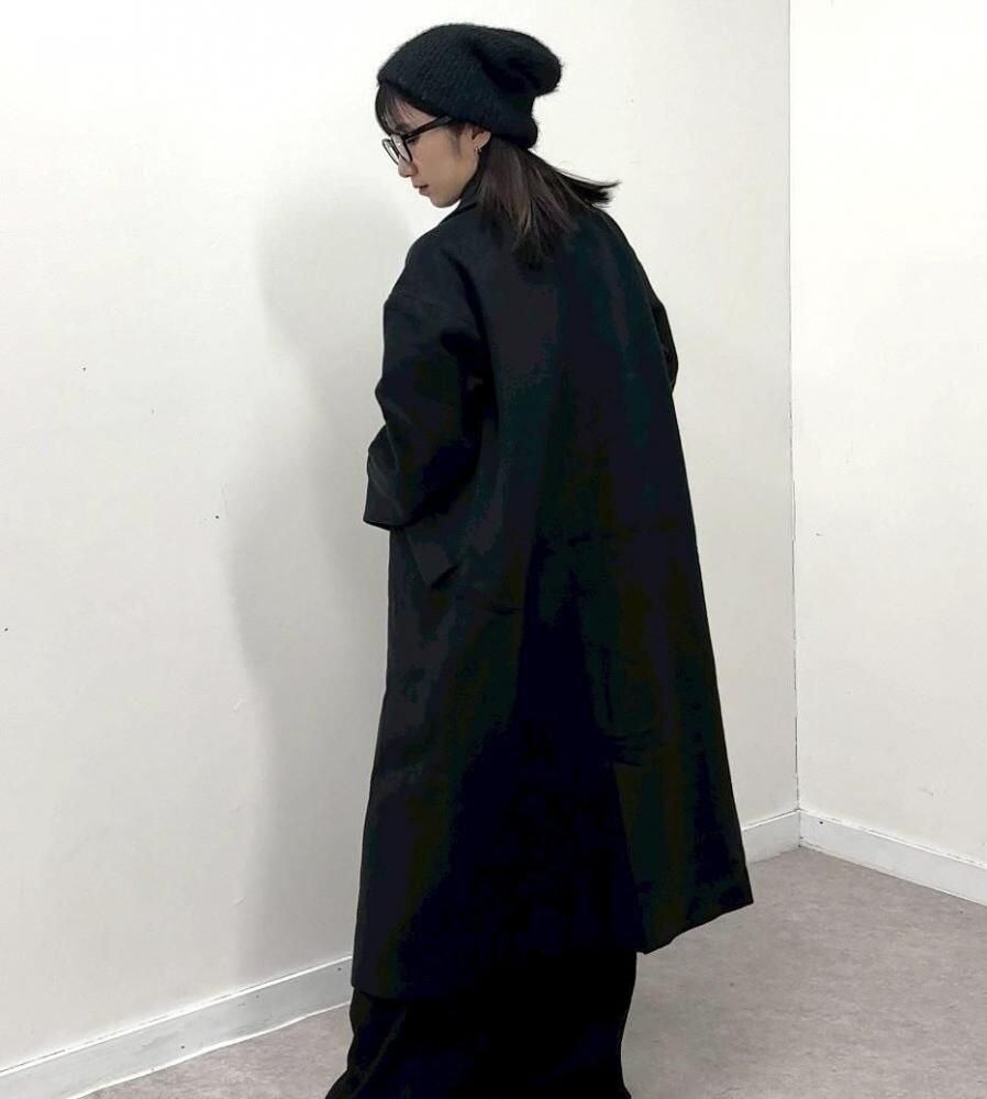 ゆったりとしたオーバーサイズ設計ながら、落ち感のある素材がスッキリとした縦のラインを強調。重たくなりがちな冬〜春の装いを、一気にモードで都会的な印象へ引き上げます。
