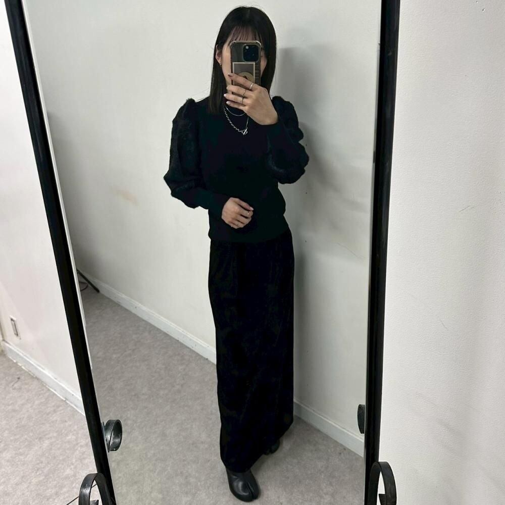 身頃はスッキリとしたリブ編み、袖はふんわりとした素材感のコントラストが、女性らしい柔らかさと華やかさを引き立てます。 首元は上品なハイネック仕様で、コートのインナーとしても映える一着。