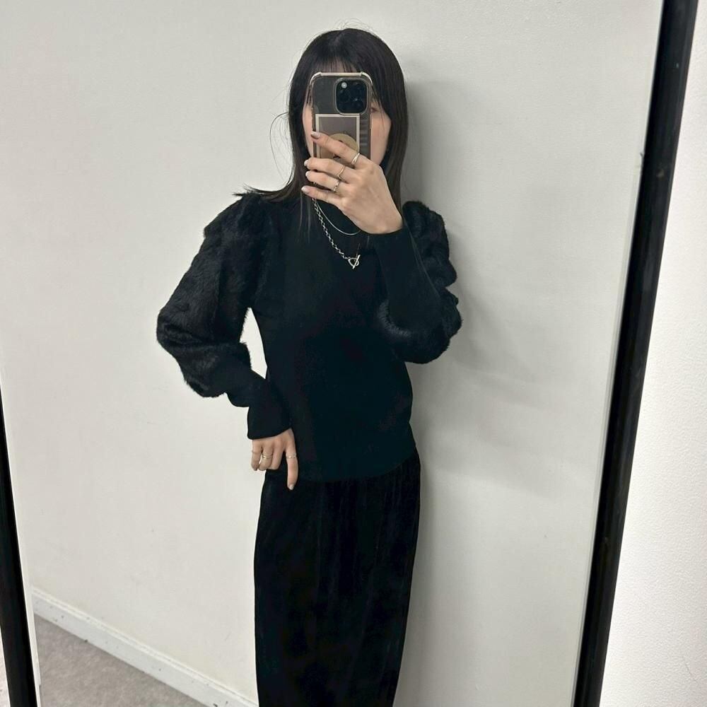 袖部分にボリュームのあるフェイクファーをあしらった、1枚で主役になるデザインニットです。