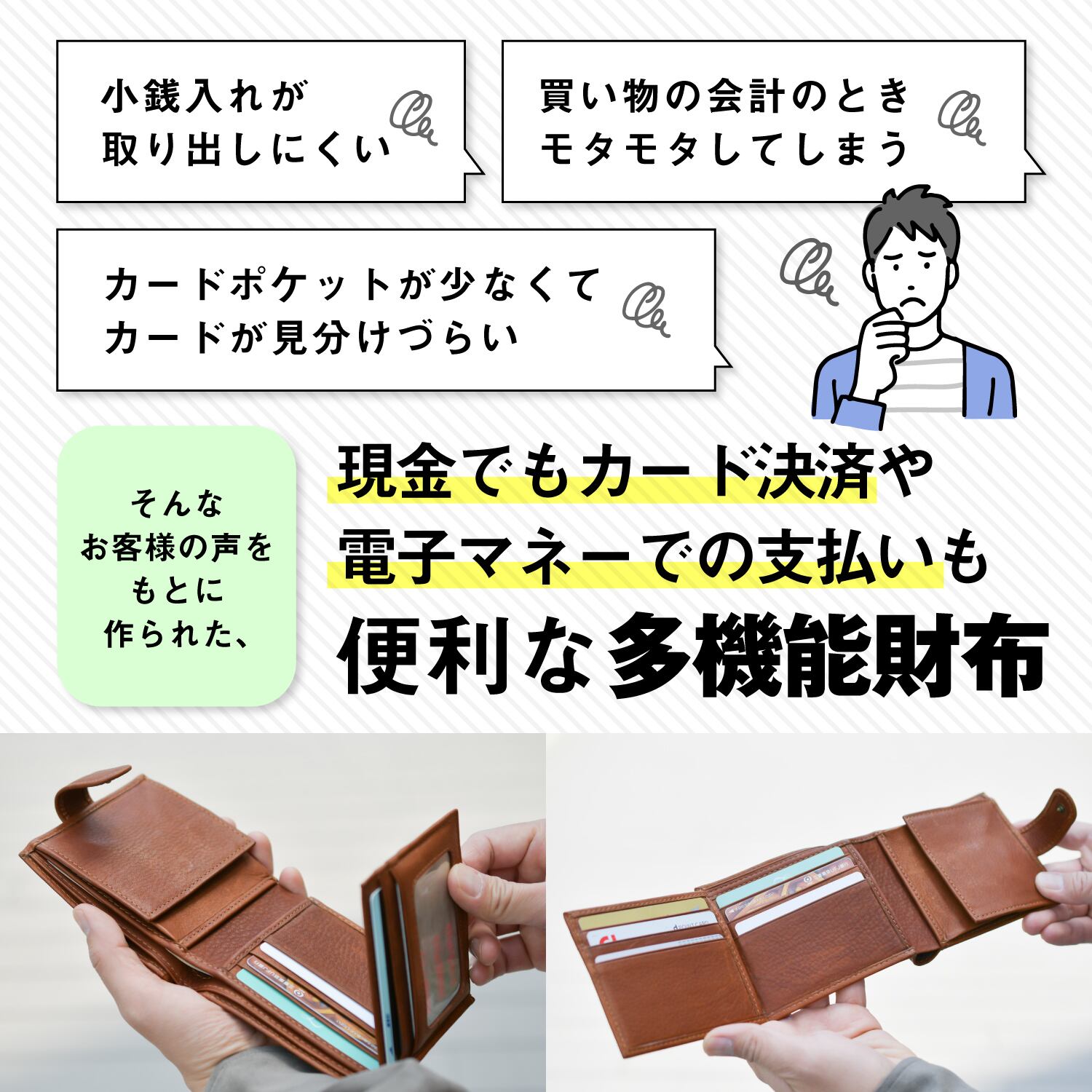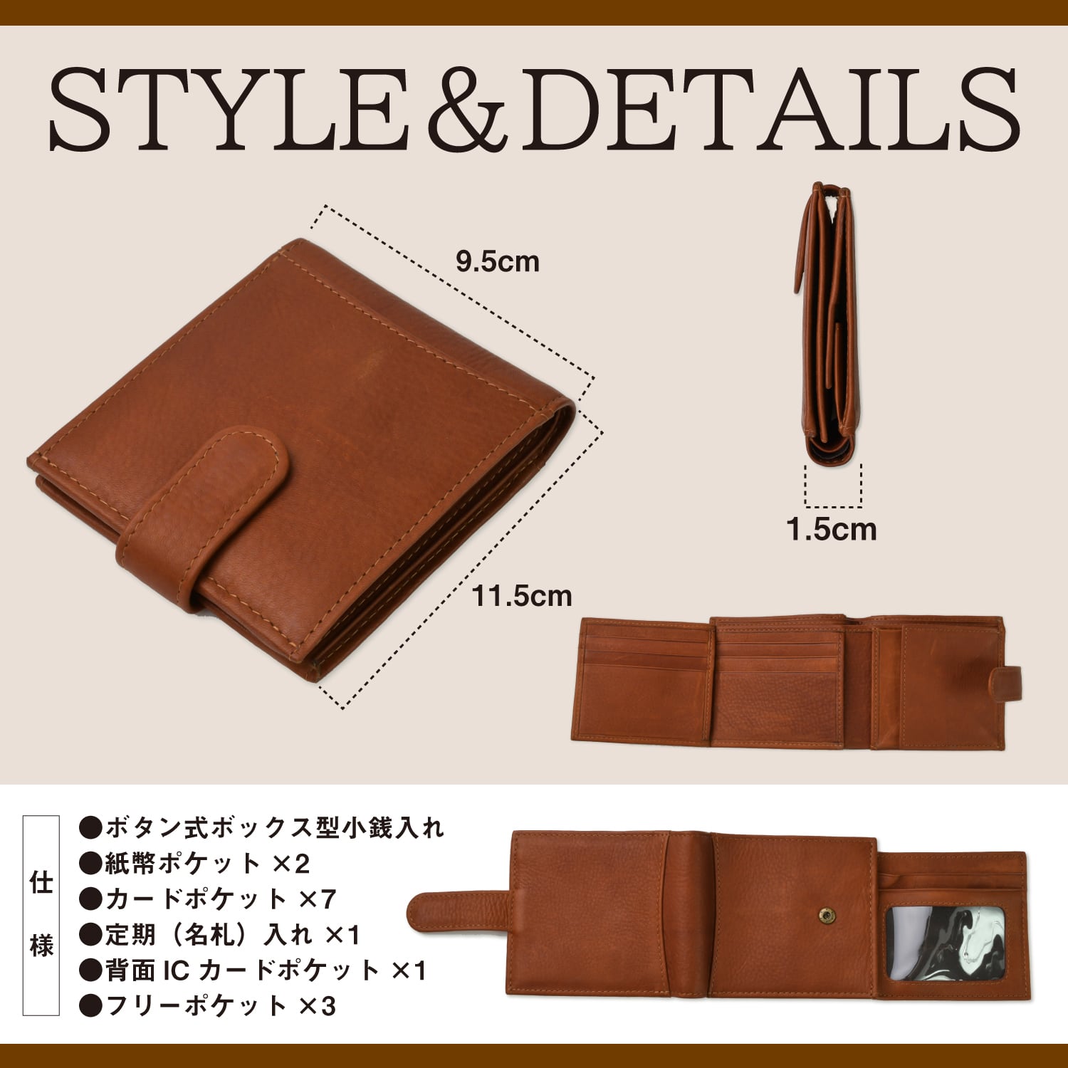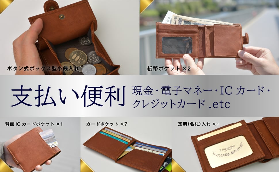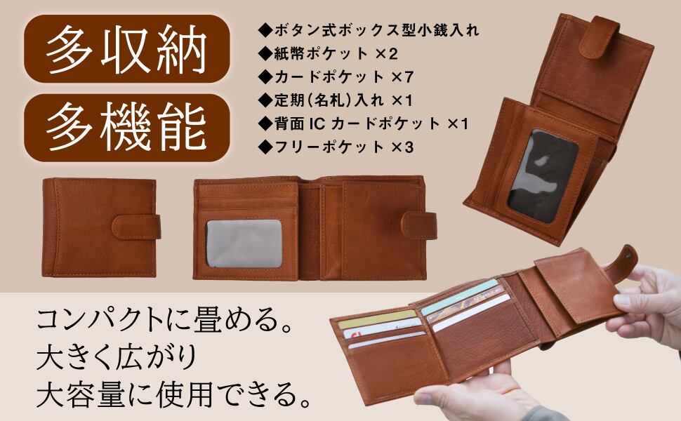 仕様:ボタン式ボックス型小銭入れ、紙幣ポケット×2、カードポケット×7、定期(名札)入れ×1、背面ICカードポケット×1、フリーポケット×3