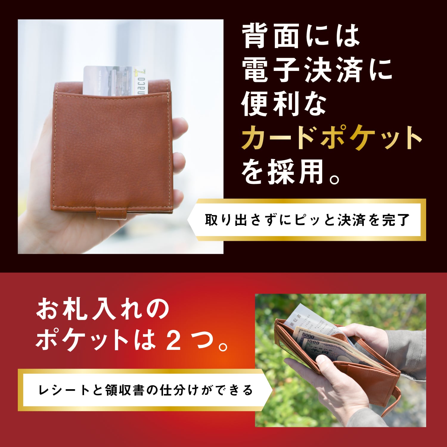 紙幣ポケットには仕切りがあり、お札と領収書を仕分けて収納できます。千円札と五千円札、一万円札を分けて入れる使い方をしてもOKです。