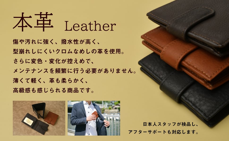 『傷や汚れが付きにくいクロムなめし加工の本革を使用』