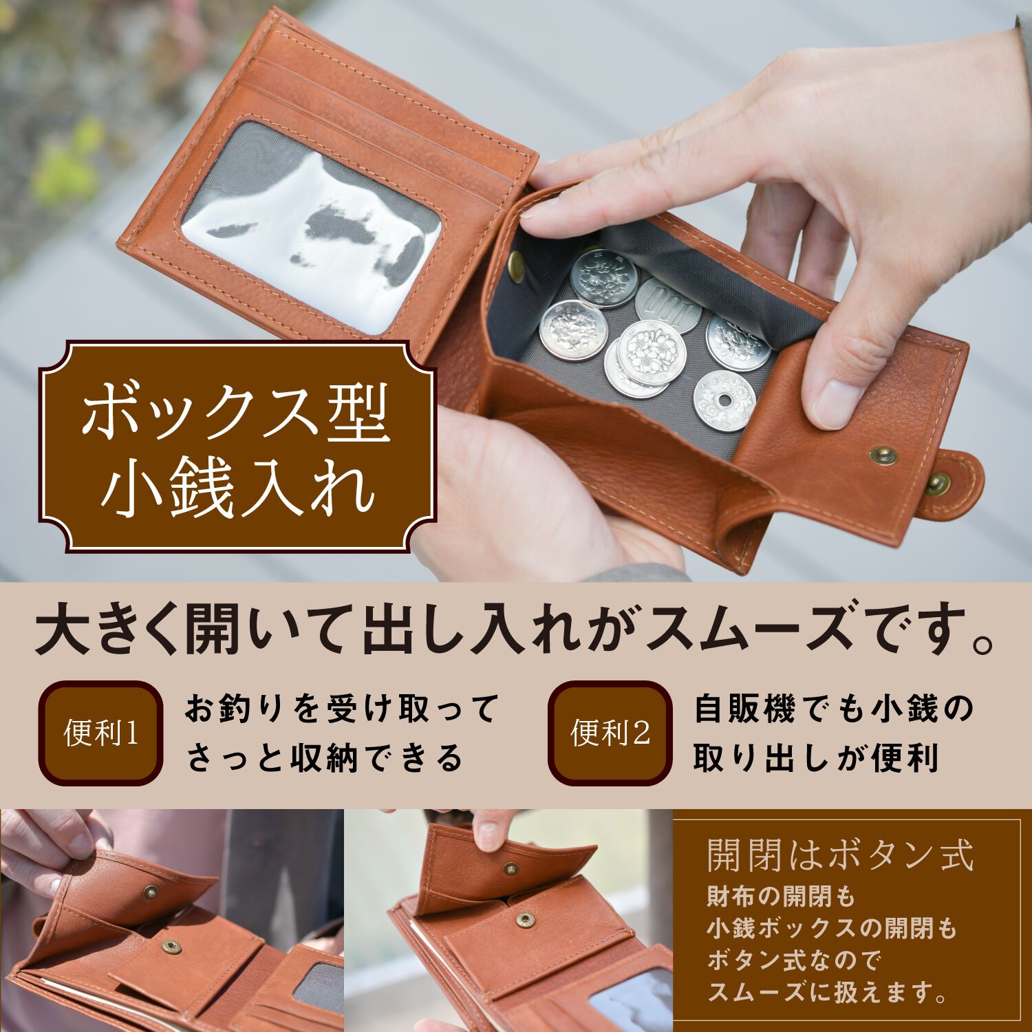 まず、小銭入れは大きく開いて使いやすいボックス型を採用。硬貨の取り出しがスムーズでストレスなく使用していただけます。